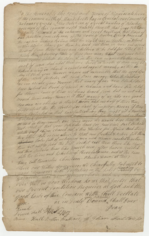 - Prince Hall petition, resulting in an act abolishing the slave trade in Massachusetts,