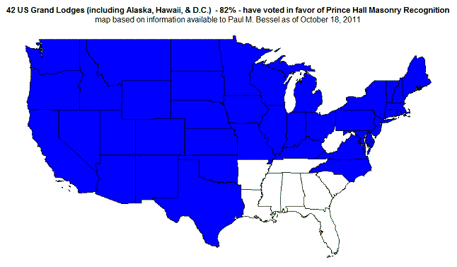 To date, 42 Grand Lodges have voted favorably toward recognition of Prince Hall Grand Lodges (82%).